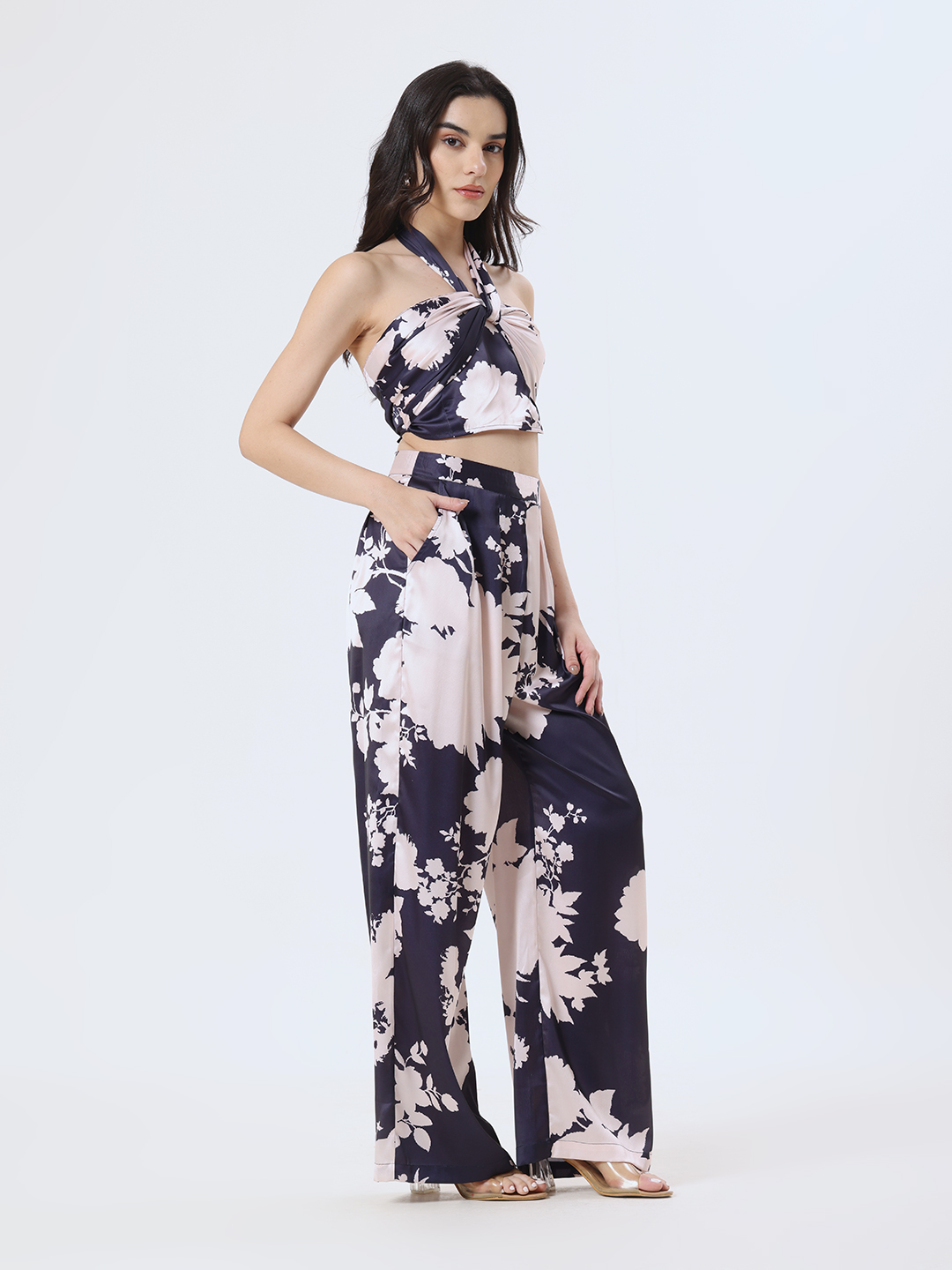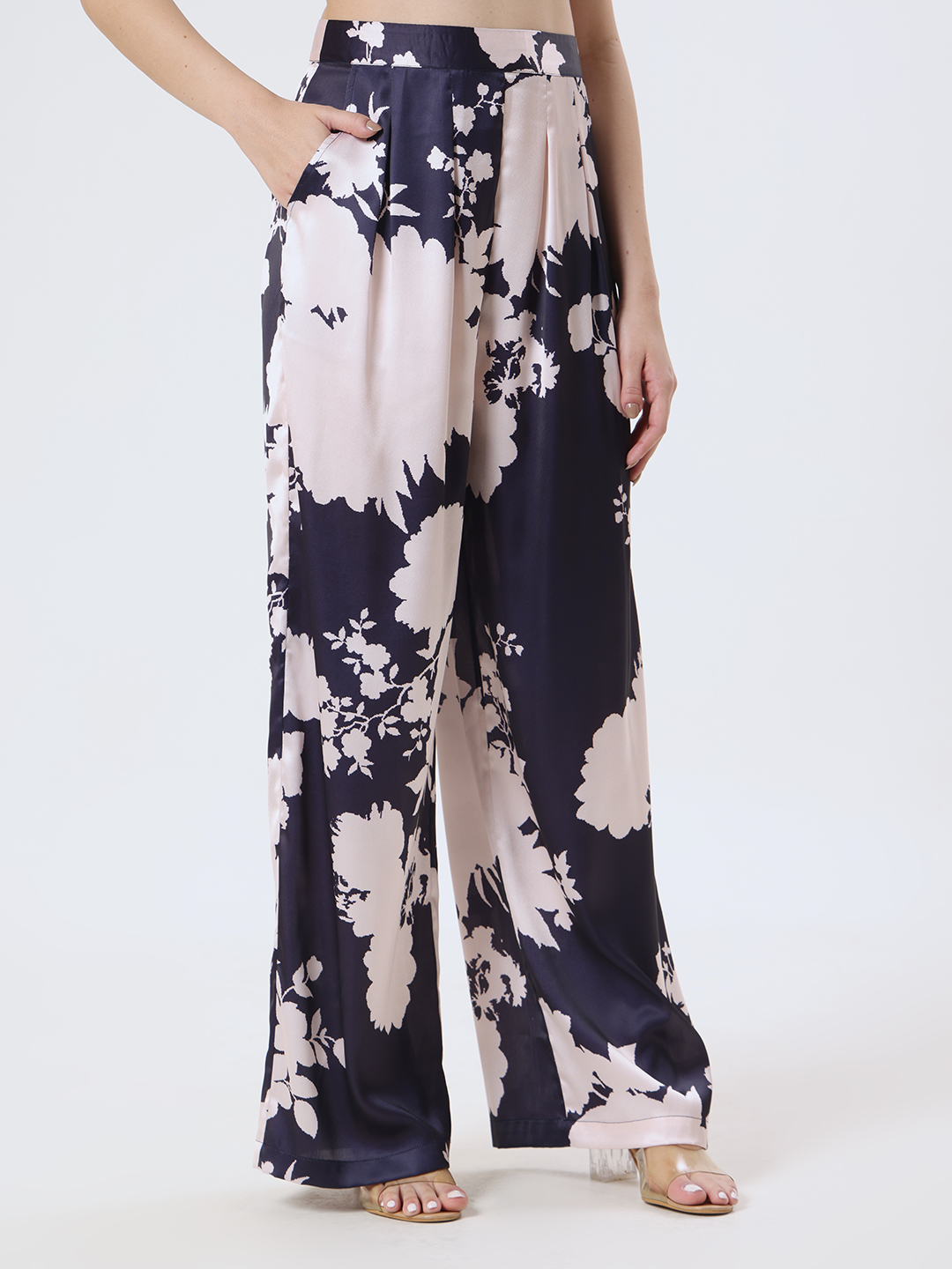 Crafted from luxury satin in a flared trousers showcased in elegant abstract floral print. Finished with refined side pocket detailing