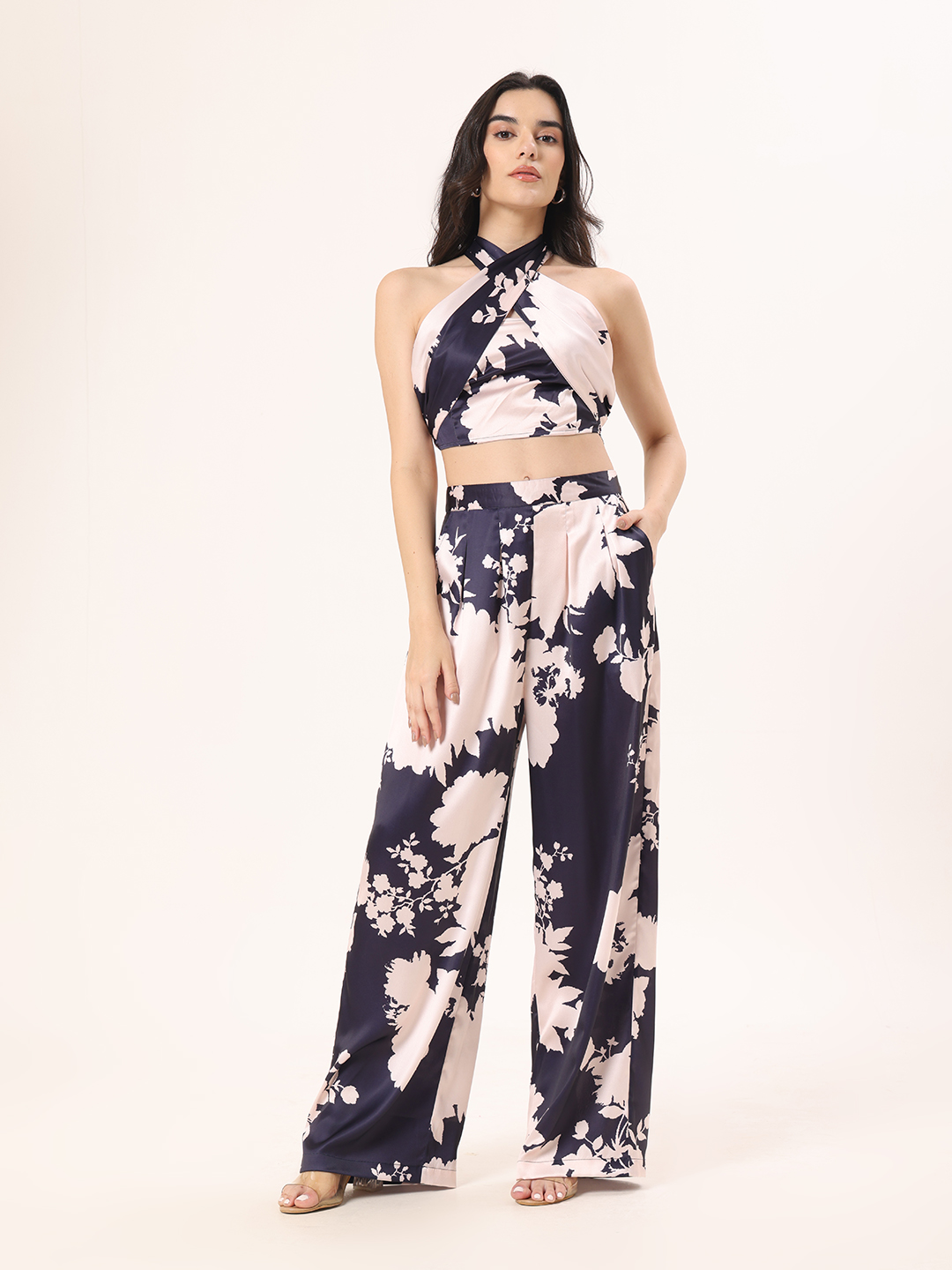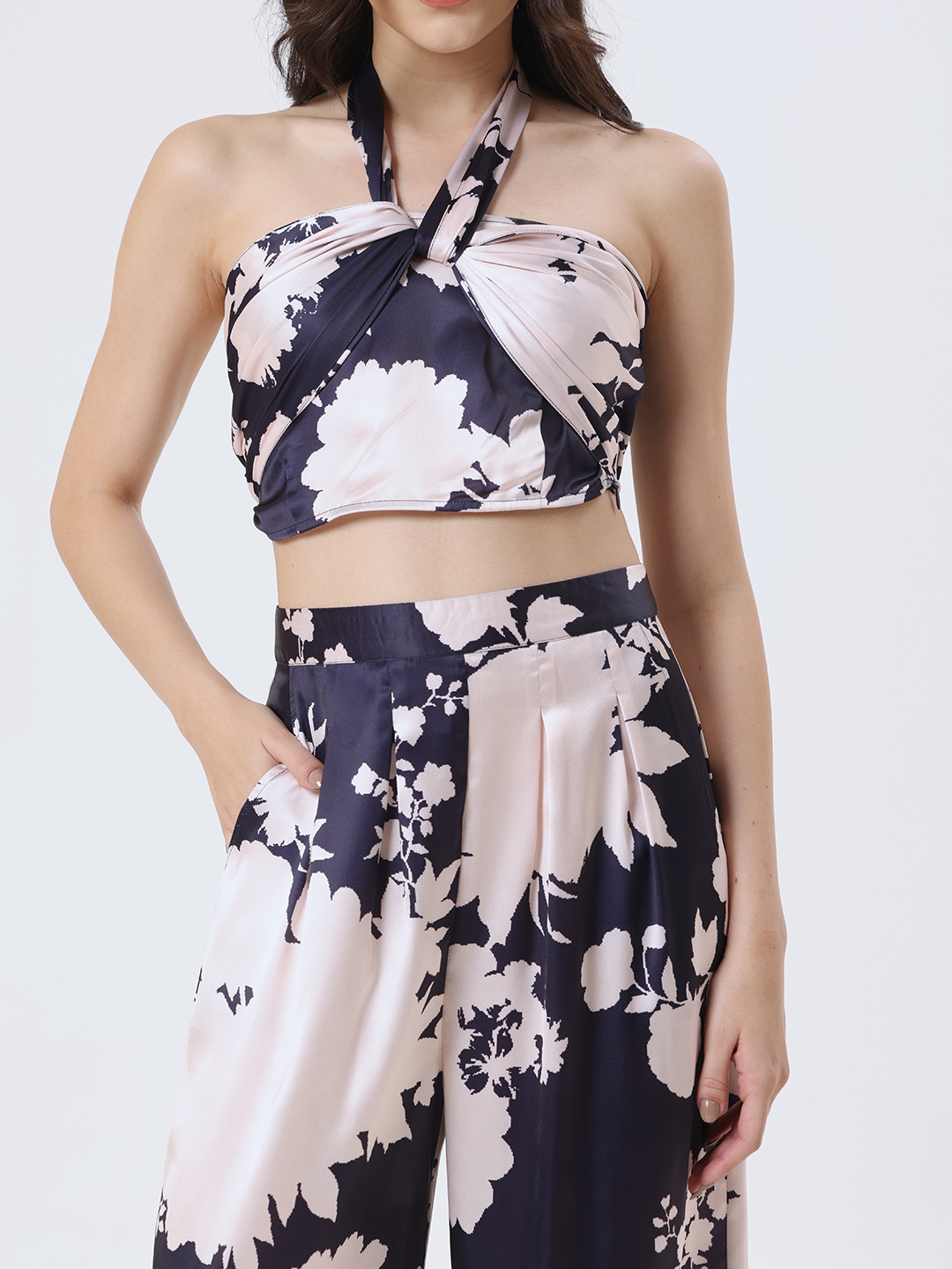 Versatile tie-top in luxurious satin midnight blue, showcased in abstract floral print that exudes refined sophistication.