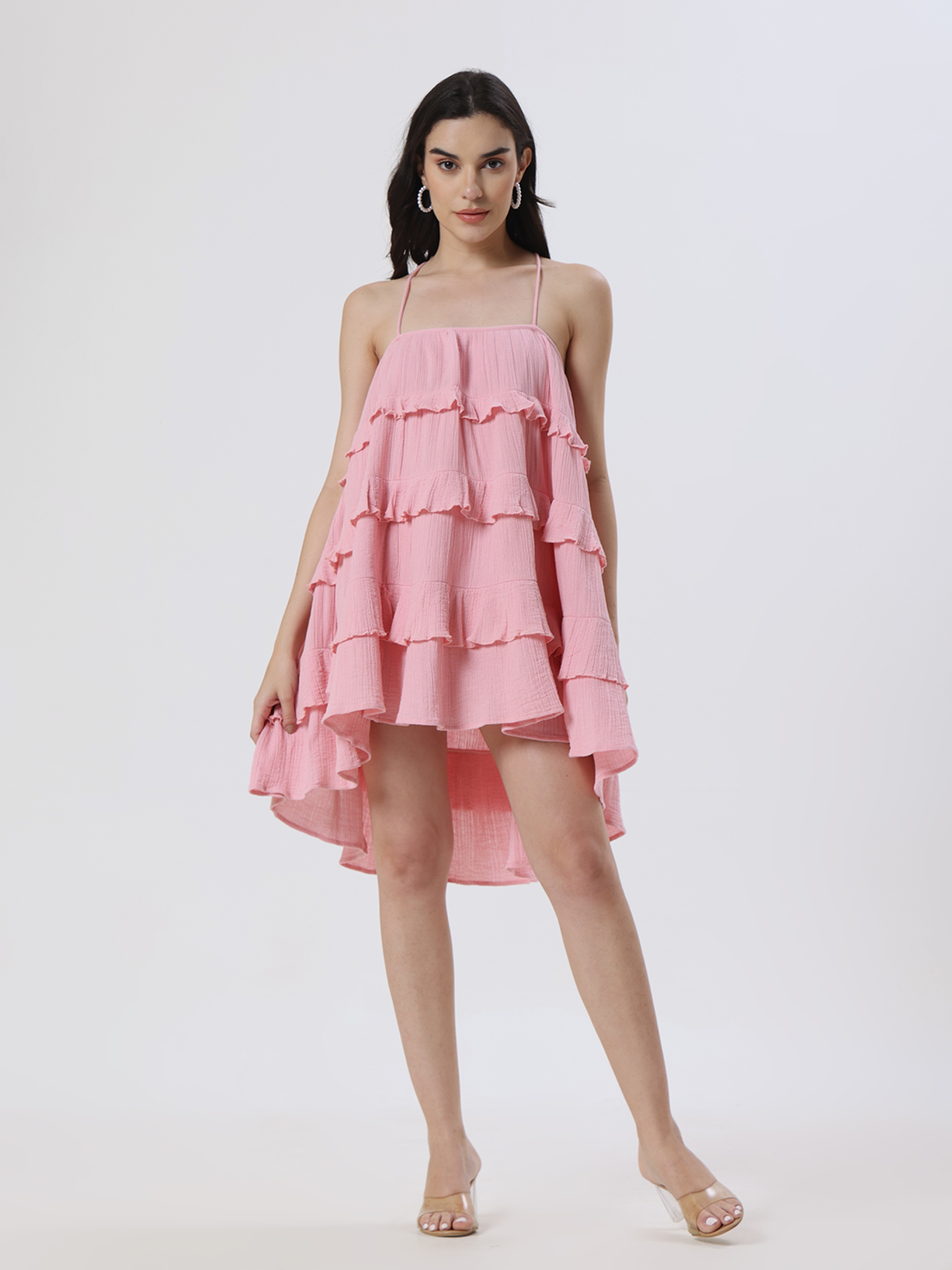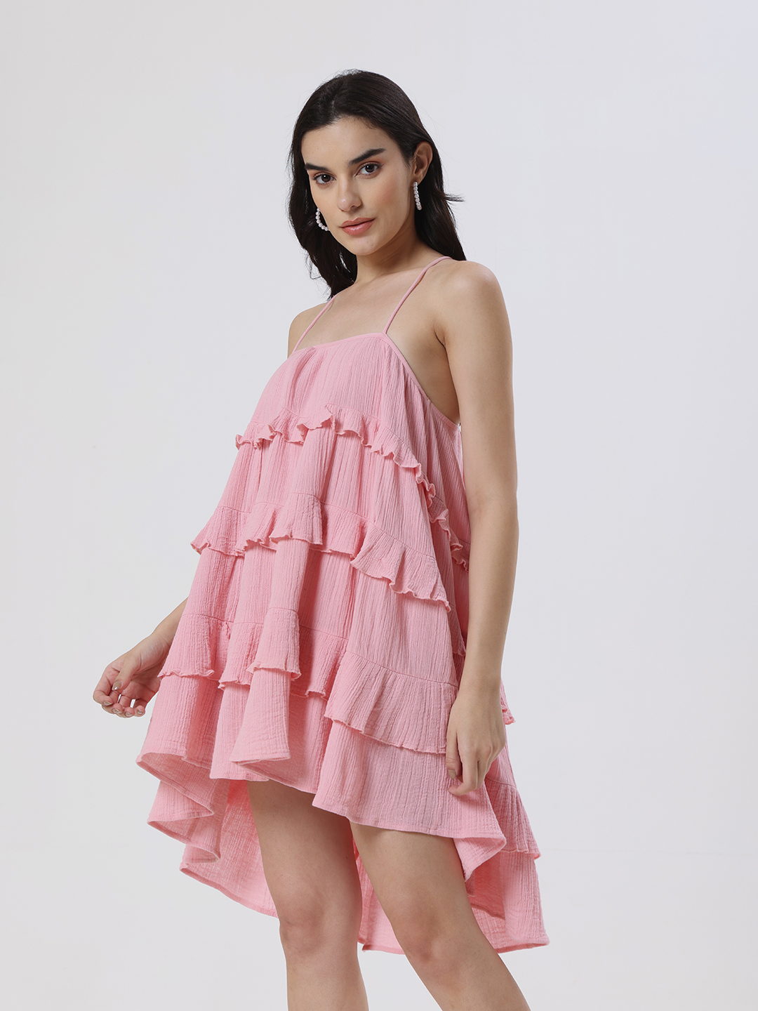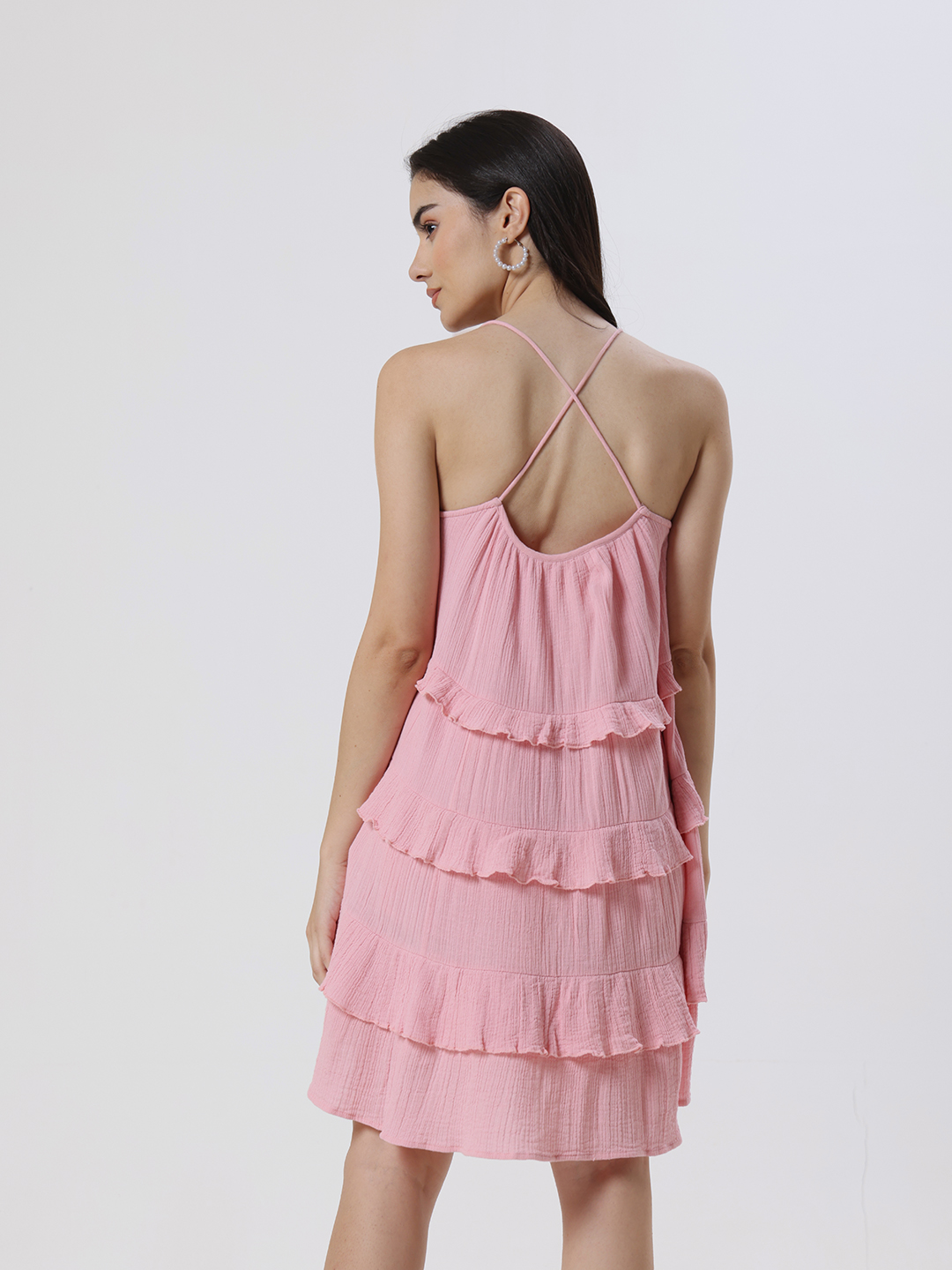 Crafted from soft cotton gauze, this flowy short dress in pastel pink features delicate ruffle accents and a chic crisscross back, offering an effortlessly elegant and feminine silhouette.