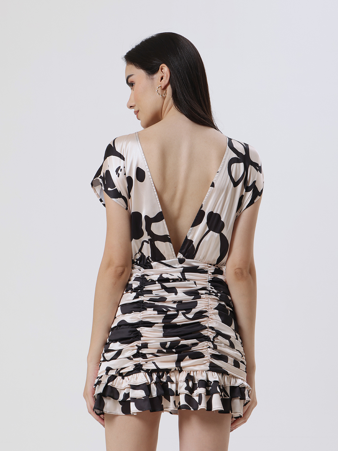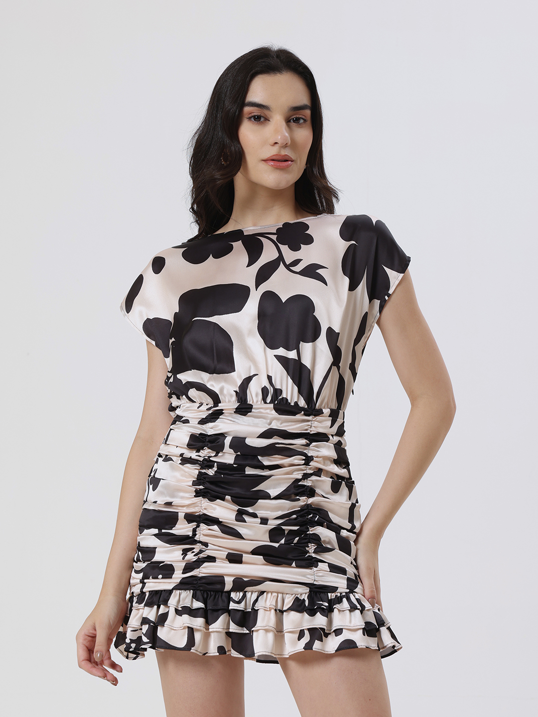 Refined Noir & Blanc floral satin dress with elegantly ruched silhouette and a statement open-back design.