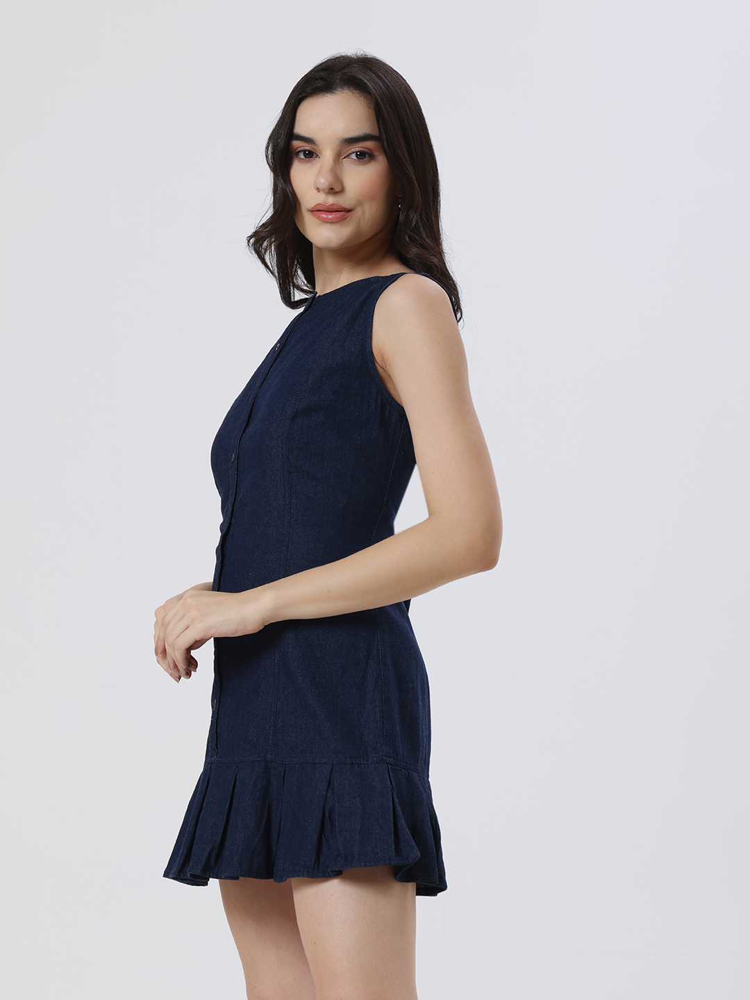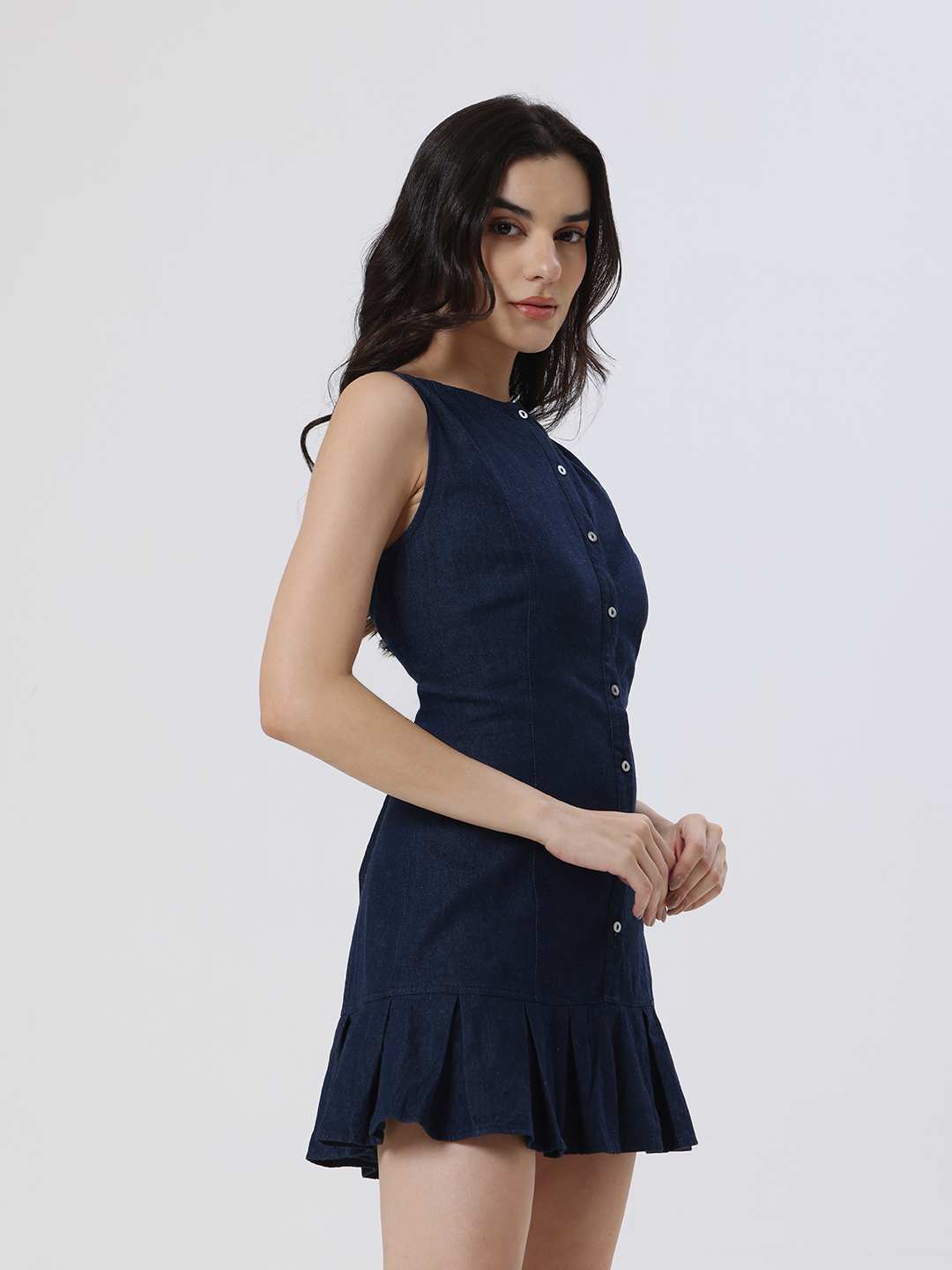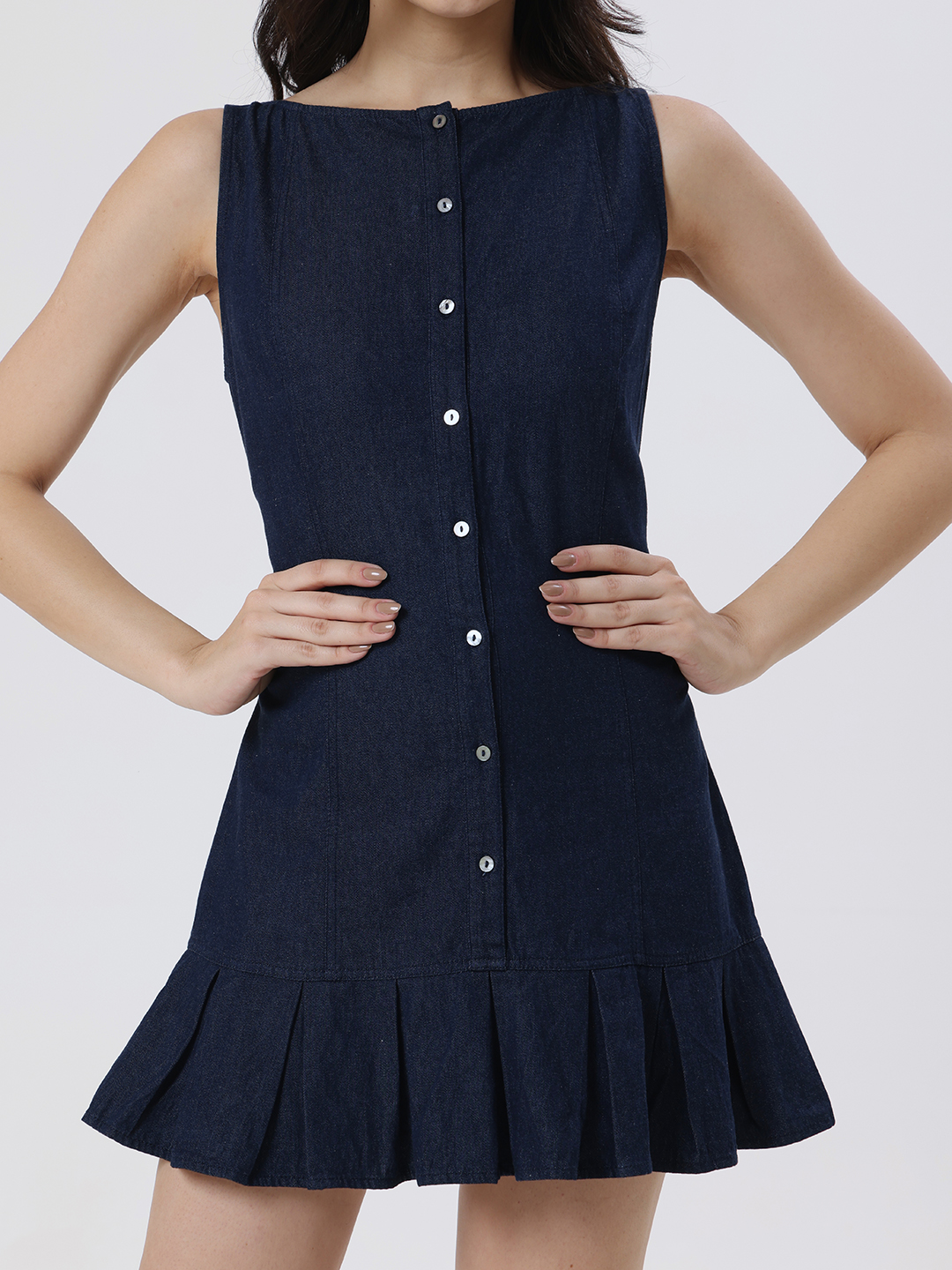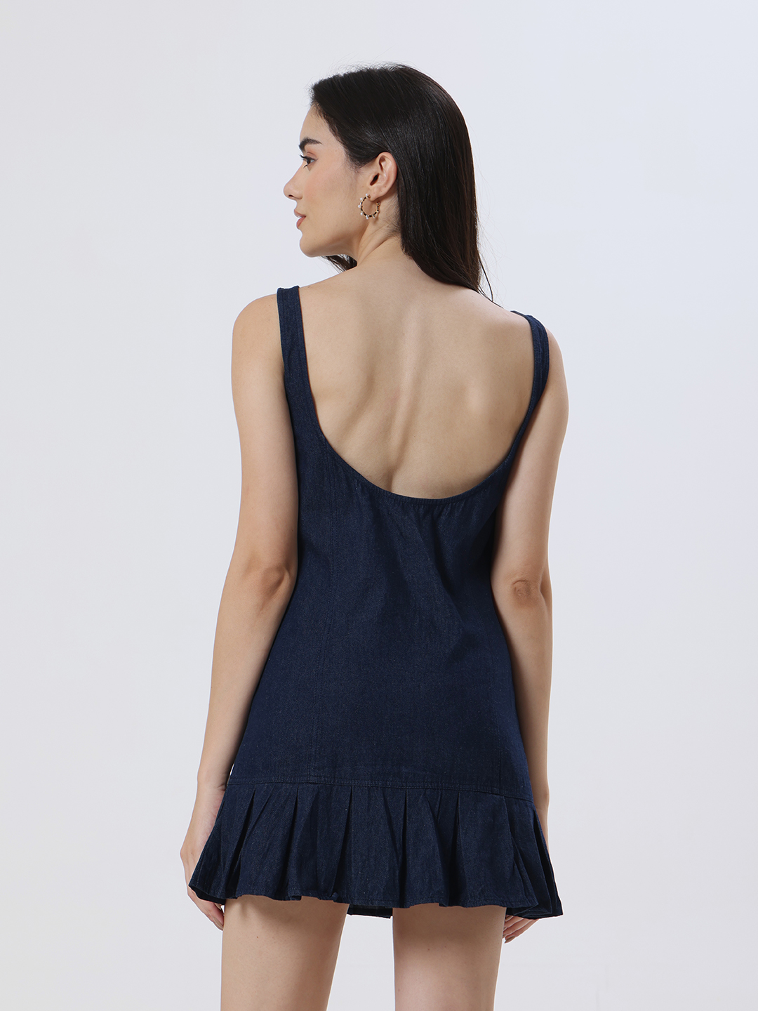 Luxury-inspired denim tennis dress with a deep “U” back, open front, and delicate shell button details.